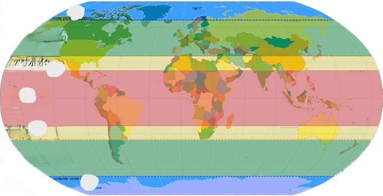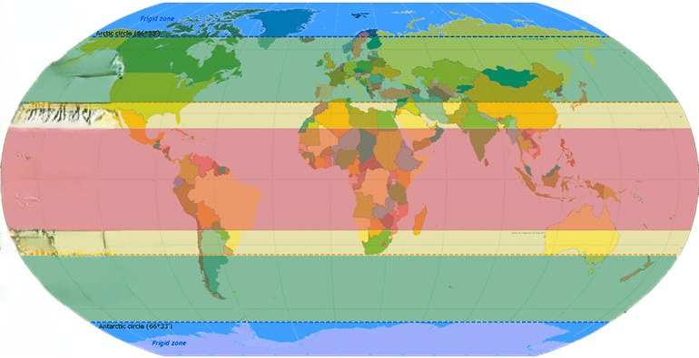 Tropisk zon, Subtropisk zon, Tempererad zon och Polarzon.