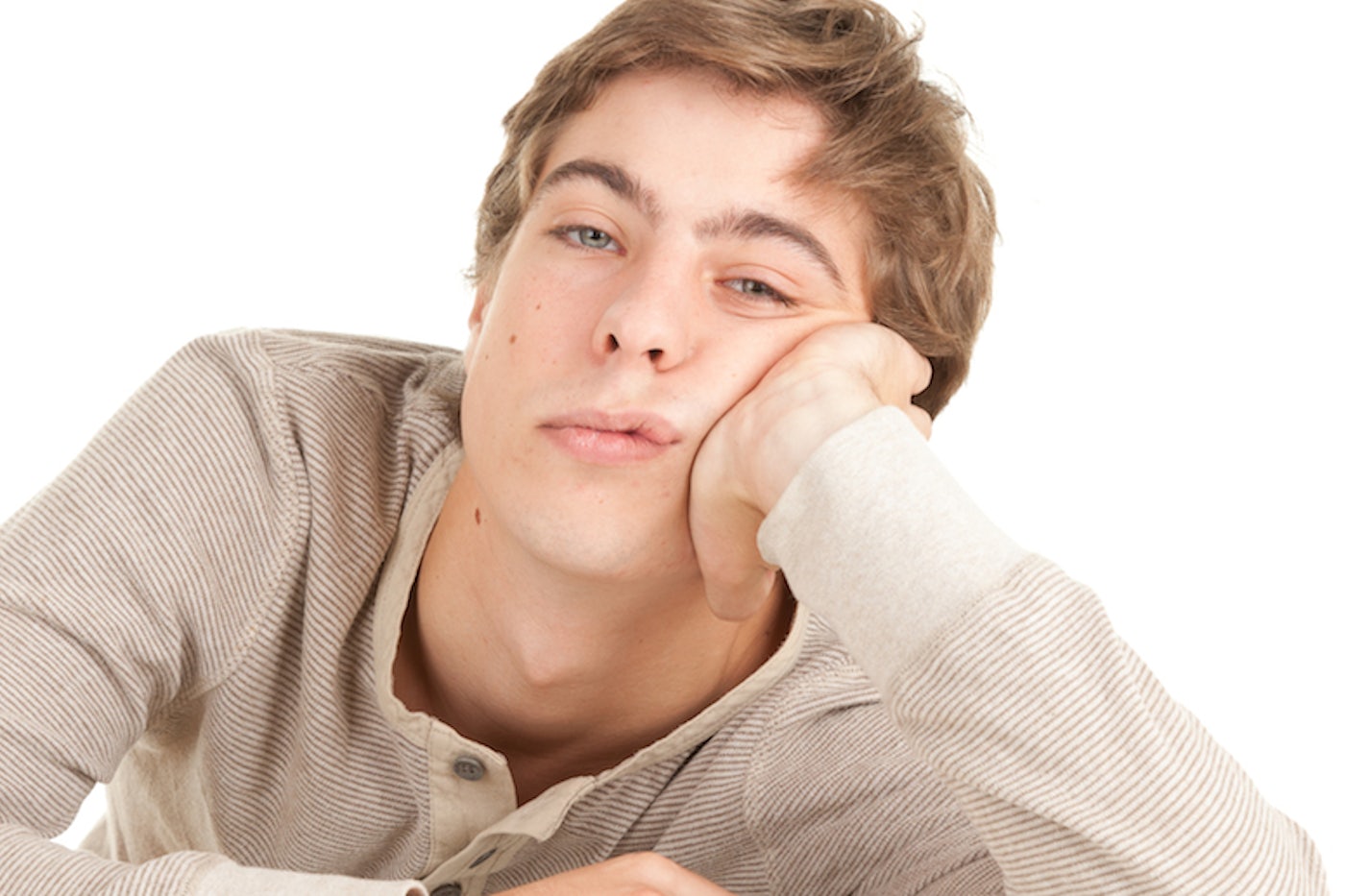 The boy is sitting at a desk with papers/books around him. His hands are on his head and his head is down. He is probably feeling frustrated because of school work.