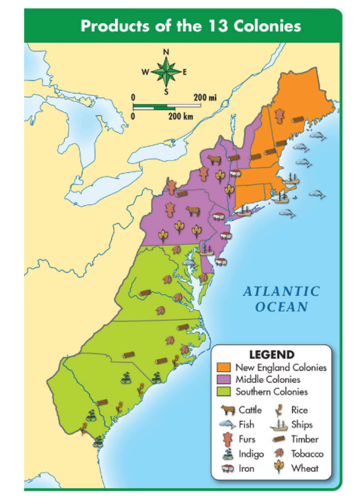 Based on this map, what main economic activities did the Southern colonies focus on?