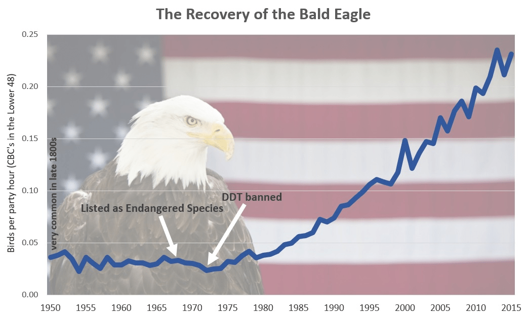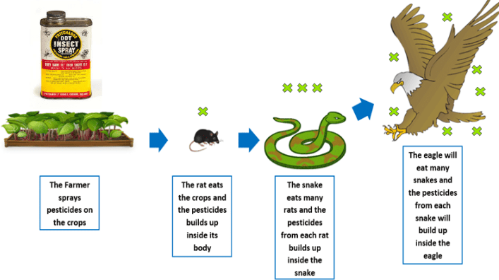 We learned about a pesticide called DDT that was used a lot between the 1940s and 1970s. Farmers sprayed it on crops, and then small animals, like rats, ate the crops and got the pesticide in their bodies. The pesticide moved up the food chain, and eventually it reached bald eagles at the top. The DDT made the eagles’ eggs have very thin shells that would crack when the mom sat on them. Because of this, bald eagles became endangered. DDT was finally banned in 1972, and since then, the bald eagle population has grown a lot and is now very strong.**note - you do not need to know the story in this much detail!