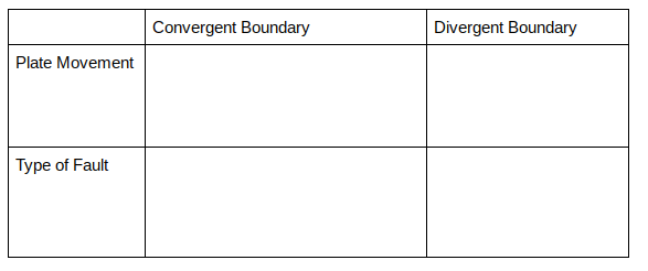 Plates Collide, Plates Move away from each other, Normal Faults, Reverse Faults