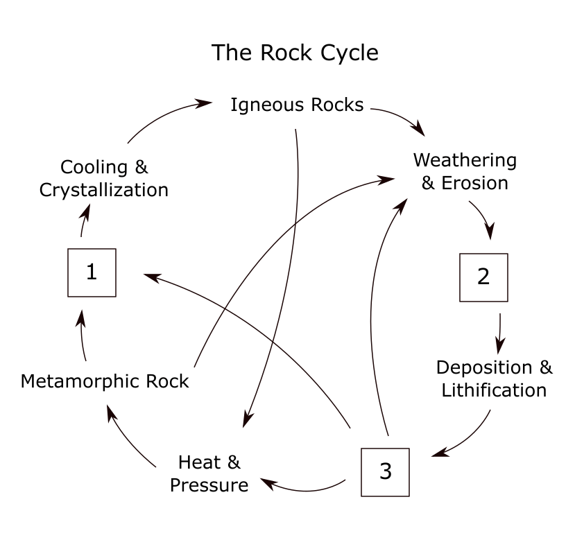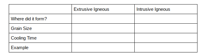 Granite, Cooled Slowly, Large Grains, Inside the Earth, Obsidian, Cooled Fast, Small or no grains, On the surface of the earth