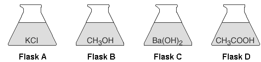 Four flasks each contain 100 milliliters of aqueous solutions of equal concentrations at 25°C and 1 atm.