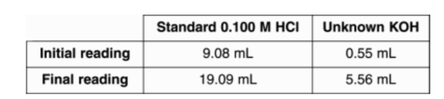 A student recorded the following buret readings during a titration of a base with an acid. What is the molarity of KOH?