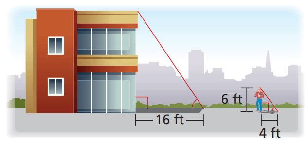 A repairman needs to climb to the top of a building.  He takes the measurements shown.  The right triangles created by each object and its shadow are similar.  Can he use a ladder that reaches heights of up to 28 feet?