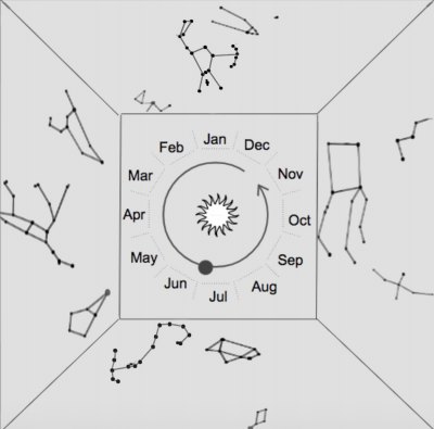 As Earth orbits the sun we see different parts of the universe therefore we see different constellations through out the year.