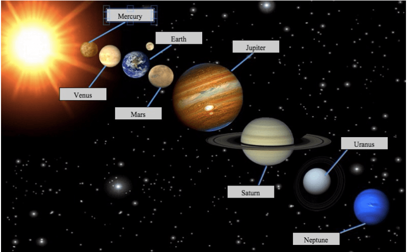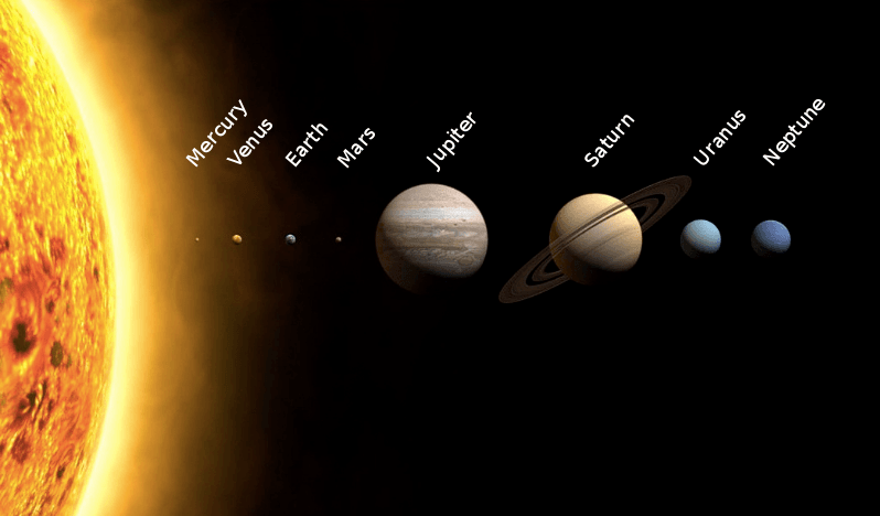 a. Sun, Earth, Venus, Mars, Jupiter, Neptune, Mercury, Uranus, Saturn.