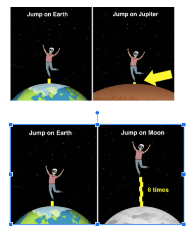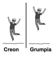 The picture on the right shows the same person jumping as high as they can on two imaginary planets, Creon and Grumpia. Which planet has more gravity?