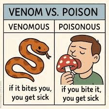 Poisonous = You bite or touch it and it has poison on it. (think poisonous mushrooms)