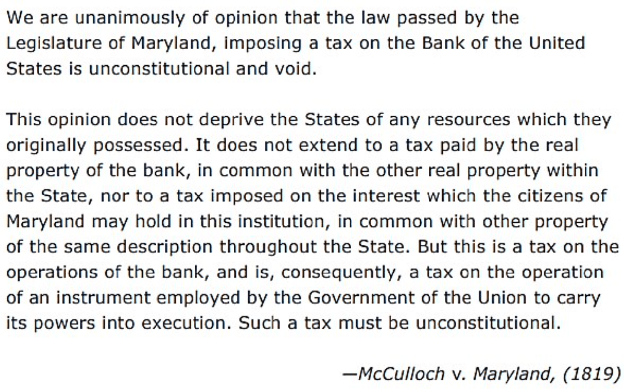 The acts of the Legislature of the State of New York, granting to Robert R. Livingston and Robert Fulton the exclusive navigation of all the waters within the jurisdiction of that State, with boats moved by fire or steam, for a term of years, are repugnant [in opposition] to that clause of the constitution of the United States, which authorizes Congress to regulate commerce, so far as the said acts prohibit vessels licensed, according to the laws of the United States, for carrying on the coasting trade, from navigating the said waters by means of fire or steam                 —Gibbons v. Ogden, (1824)