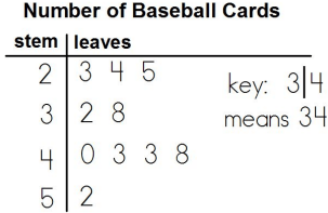(6.13A) Wesley surveyed his baseball team and asked them how many baseball cards they had. The stem-and-leaf plot below was created with the data Wesley collected.