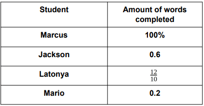 (6.2D) For a vocabulary assignment, Mrs. Strickland told her class that they must draw pictures for at least 10 of their vocabulary words. The table below shows the progress of 4 students.