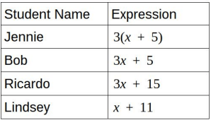 (6.7D) Mrs. Strickland asked her class to write an algebraic expression on their paper. The table below shows expressions that 4 students wrote.