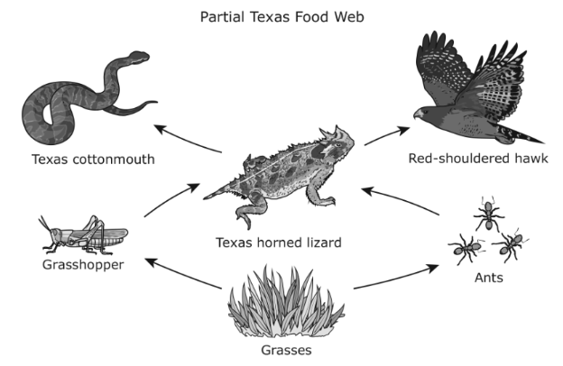 Which TWO populations would most likely increase as a result of a disease that suddenly reduces the population of Texas horned lizards?