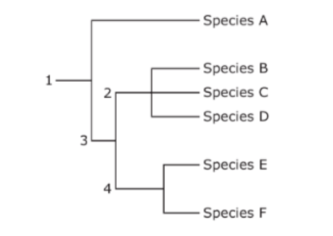 Which numbered location on the phylogenic tree identifies characteristics shared by species B, C, and D?