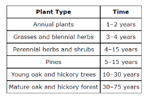 The table shows the predominant plant types on a piece of land in the years following a disturbance. Based on the chart, which disturbance most likely led to this progression?