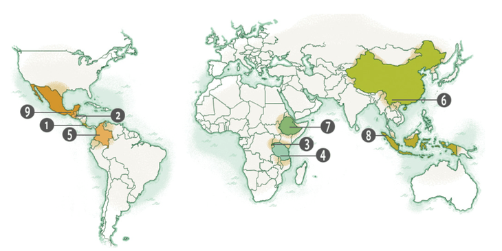 Costa Rica, Guatemala, Rwanda, Tanzania, Colombia, China, Ethiopia, Indonesia, Mexico