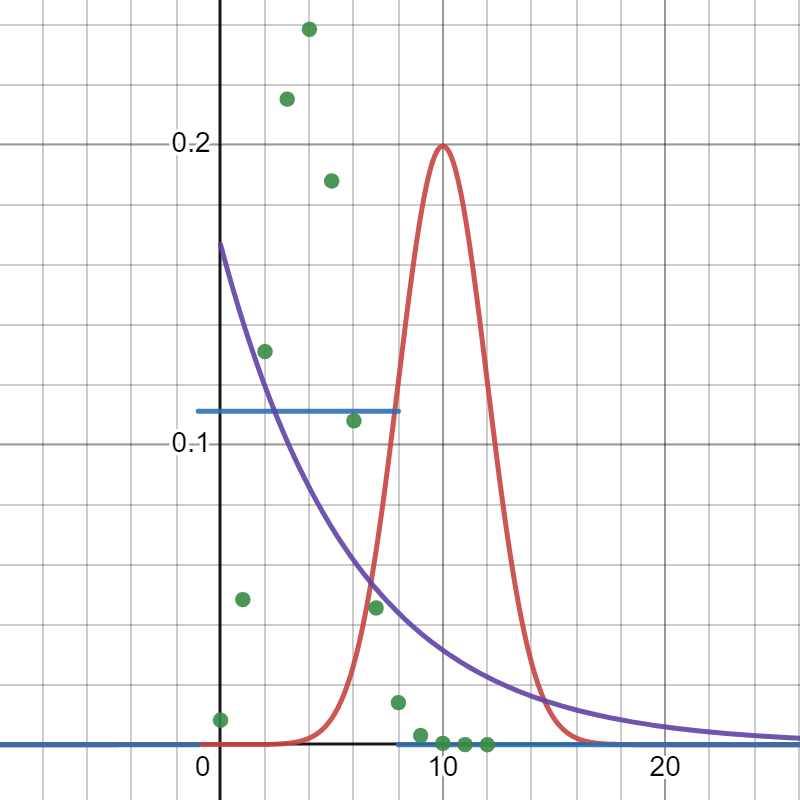 In Red: n(\mu = 10, \sigma ~~ 2). In Blue: Continuous Uniform on [-1, 8]. In Green, Binomial with n = 12 and p = 1/3 (note the mean, np is the peak at 4). Purple is exponential ( \beta = 6 but it's hard to estimate that.