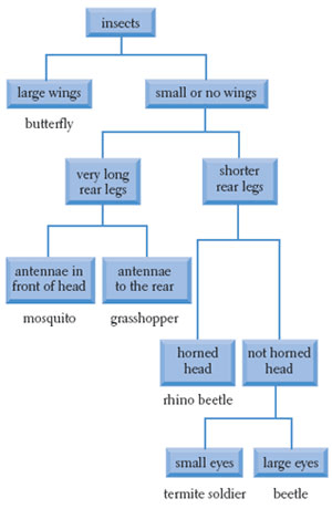 Using the dichotomous key, classify an organism that has small or no wings, shorter rear legs, not a horned head and small eyes.