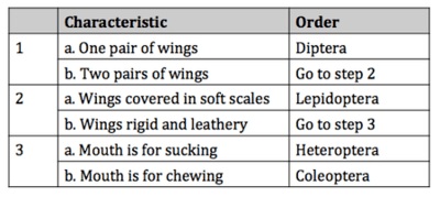 A dichotomous key for insects is given. To what order does an insect with two pairs of scaly wings belong?