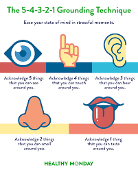 What is grounding, box breathing, journaling, drawing, listening to music, play with a pet, color, ask for help, read, take a walk etc.?