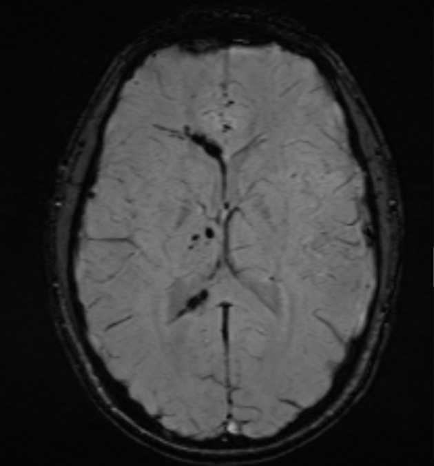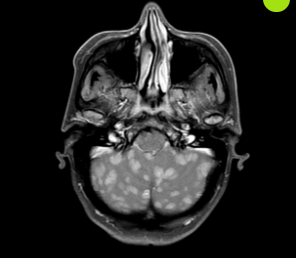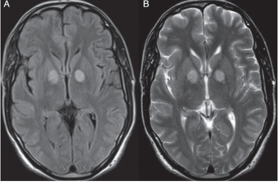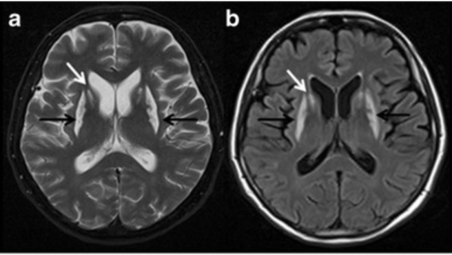 It's Christmas, and your grandfather takes out his famous "pitorro de coco" that has been marinating for the last 10 years. After one too many shots, he starts to present with an acute headache, nausea, and visual changes. His Brain MRI shows the following findings. Looks like grandpa's pitorro gave him this disease.