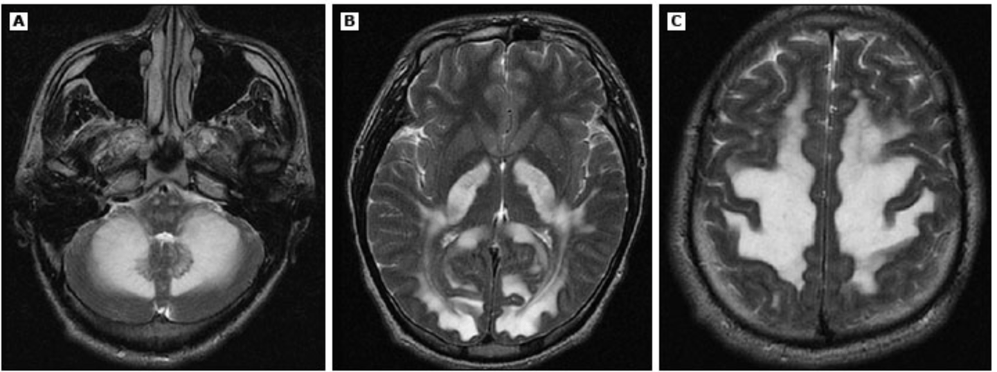 The patient is brought by EMT after being found with confusion, incoordination, and inattentiveness. On review of history, the patient refers to inhaling a substance, but is to droswy to recall the name. On PE he has UMN and ataxia. The following imaging is obtained.
