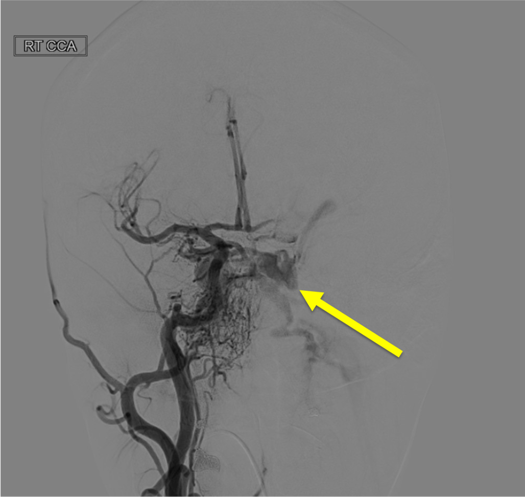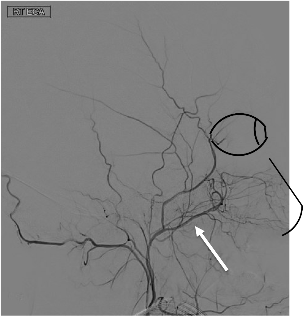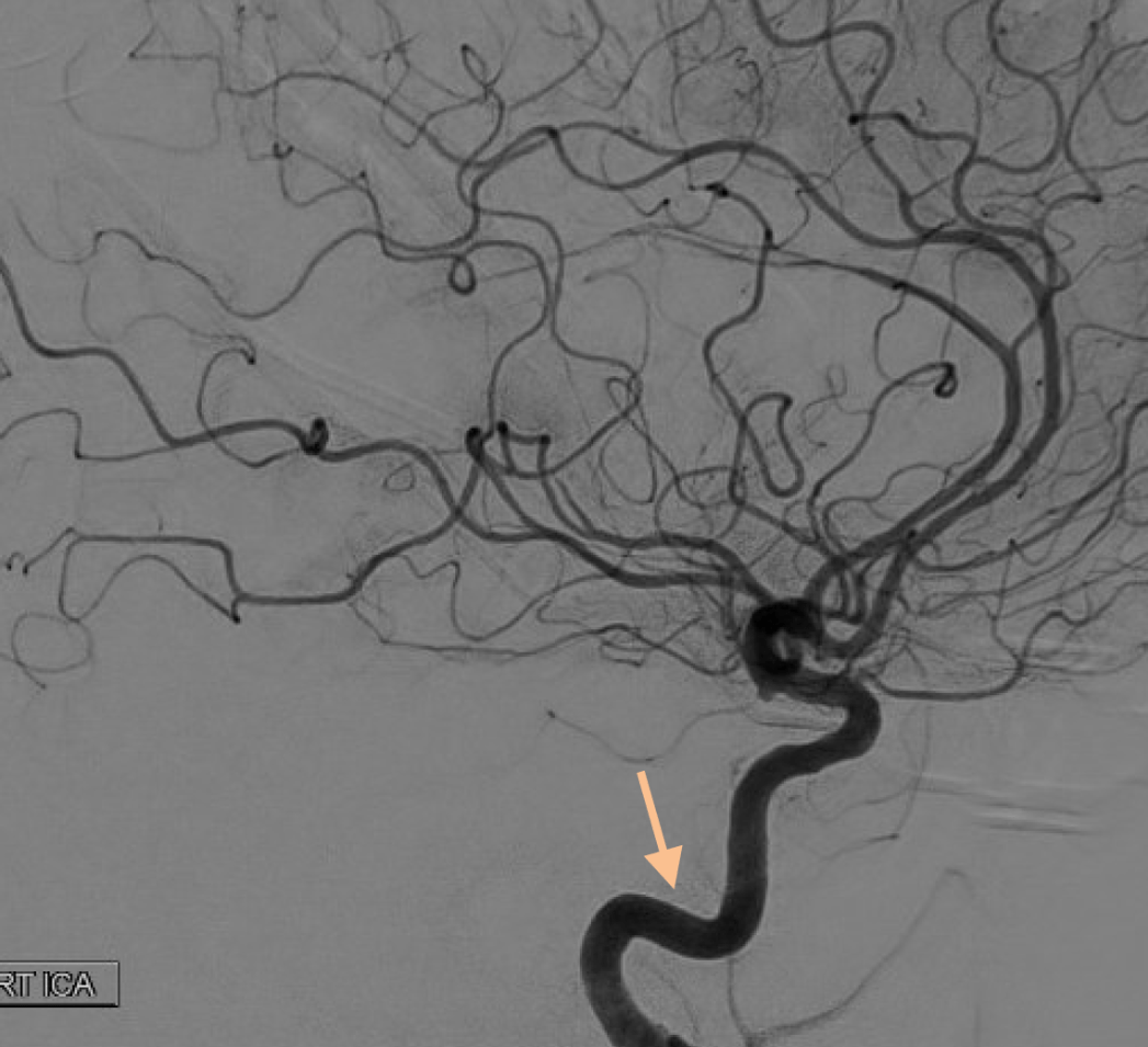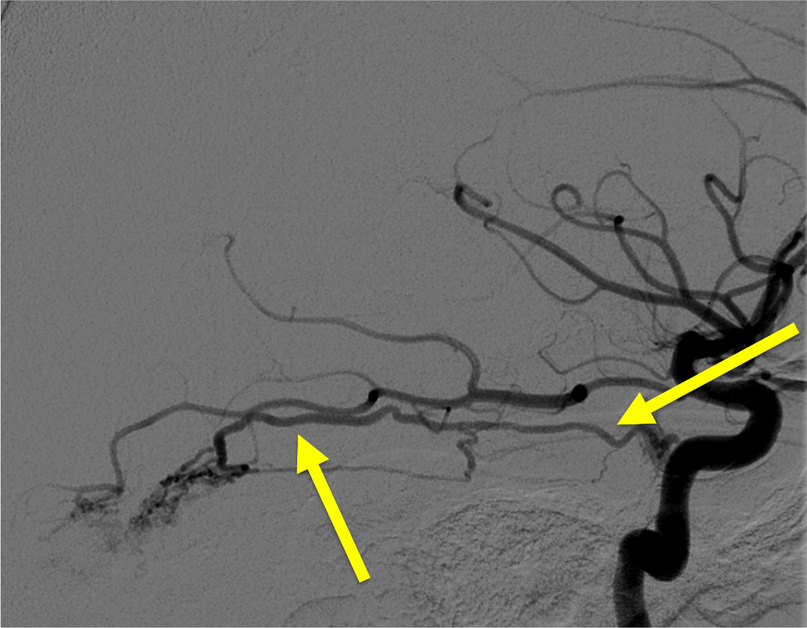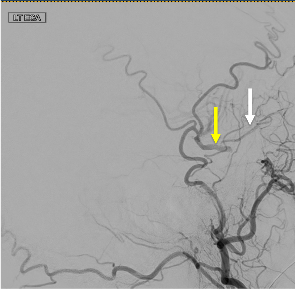 White arrow is the Ophthalmic artery-- here, likely collaterals from the ECA (through the internal maxillary artery --> ethmoidal artery) collateralize with the ICA through retrograde filling of the Ophthalmic