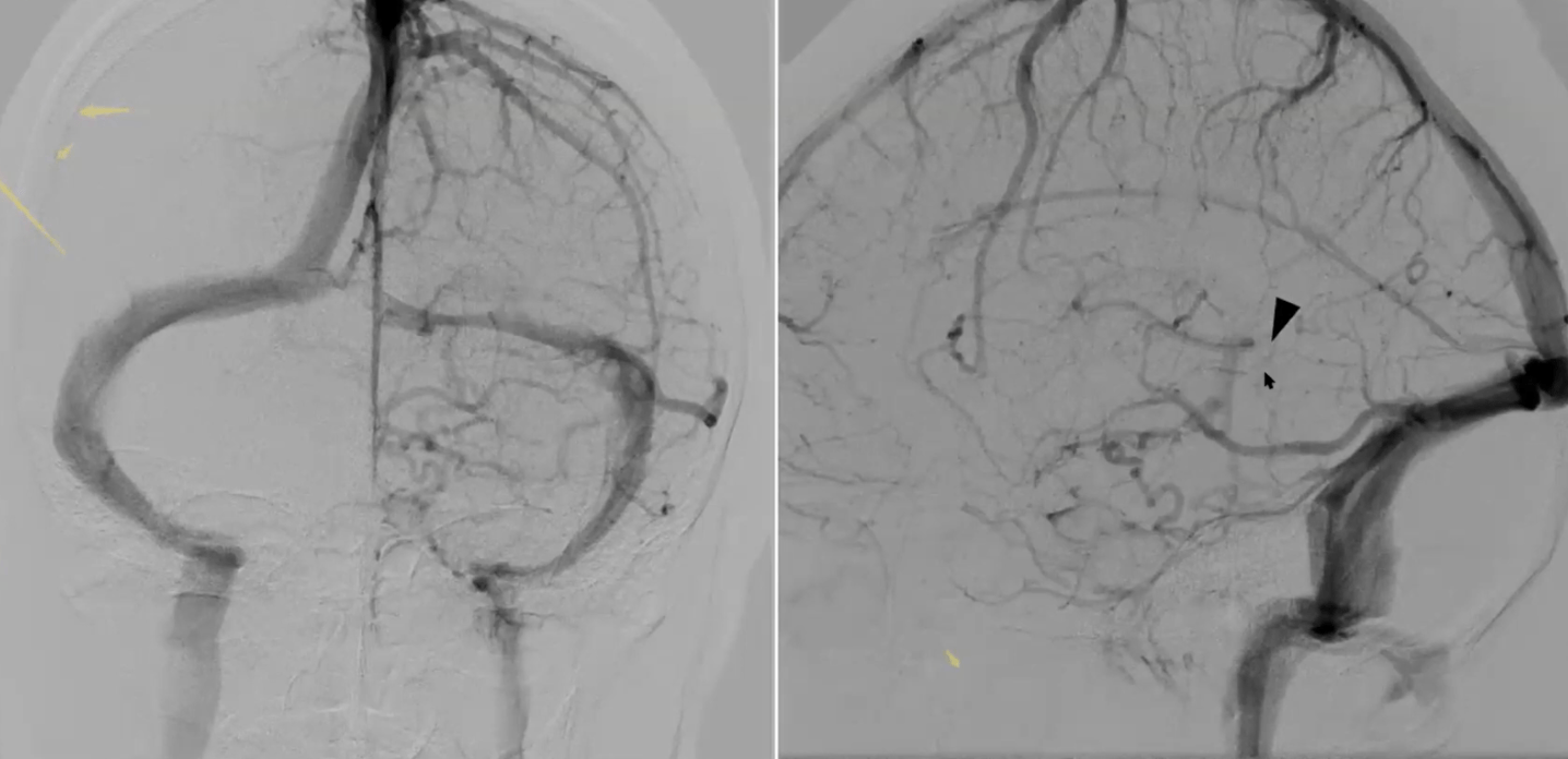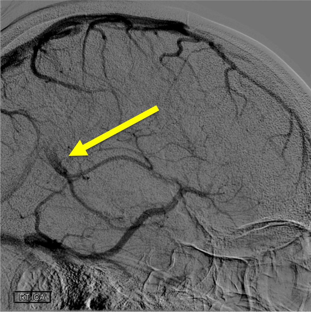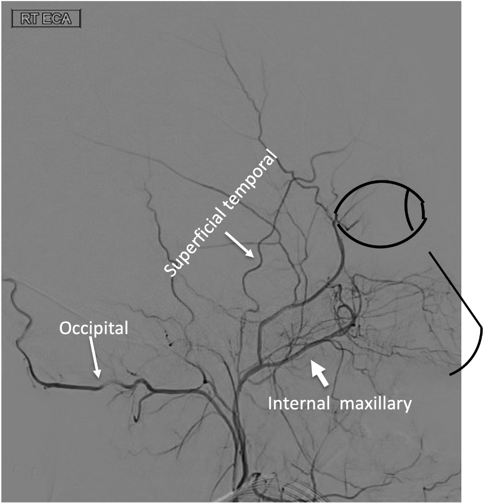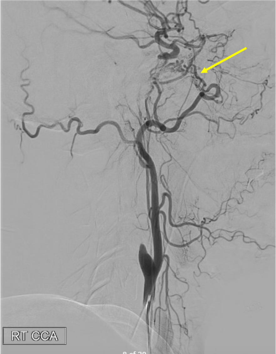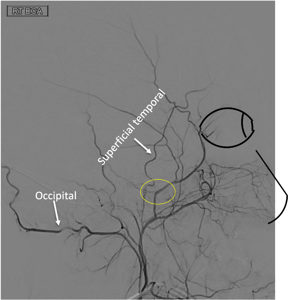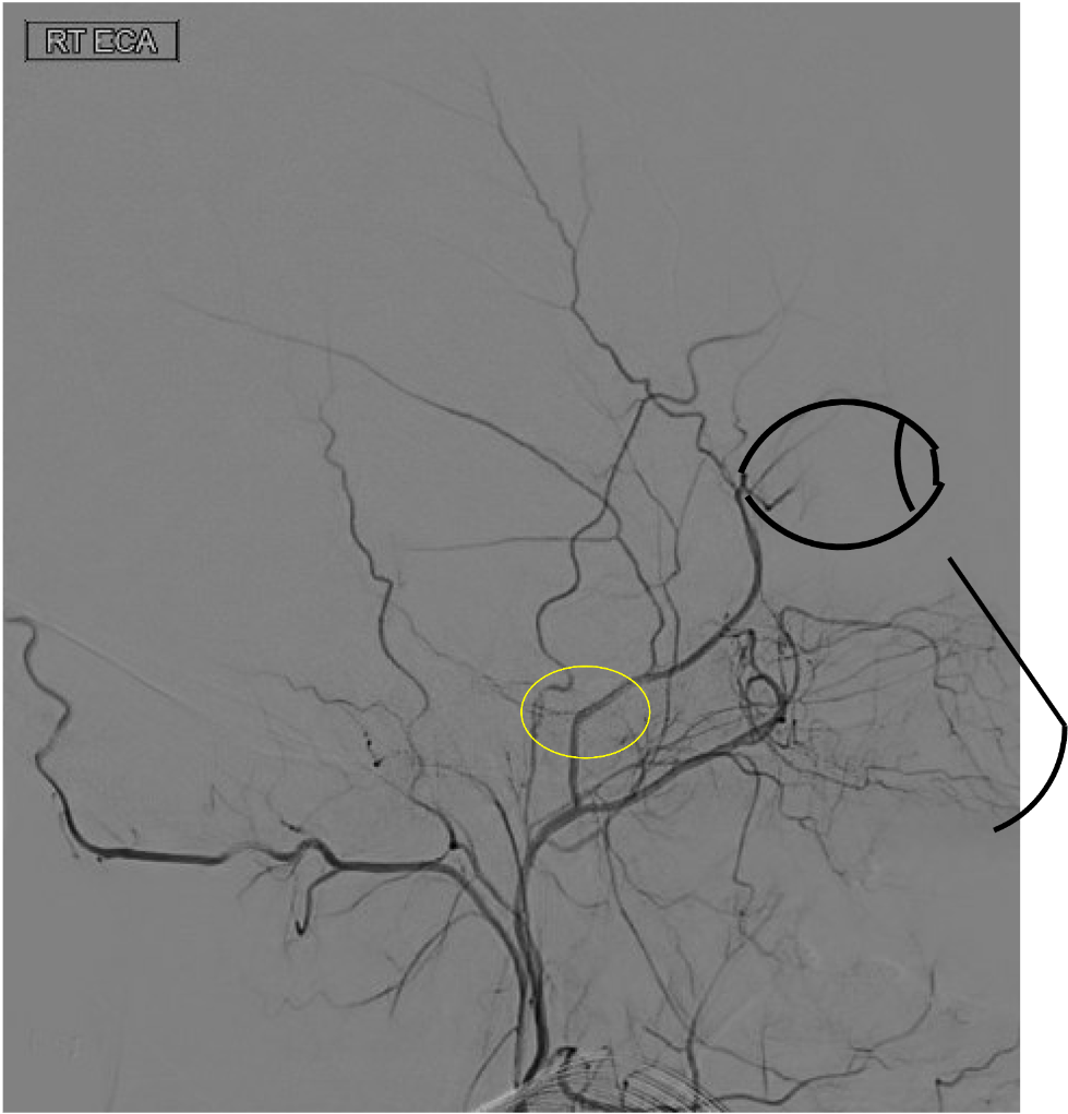 White arrow is the Ophthalmic artery-- here, likely collaterals from the ECA (through the internal maxillary artery --> ethmoidal artery) collateralize with the ICA through retrograde filling of the Ophthalmic