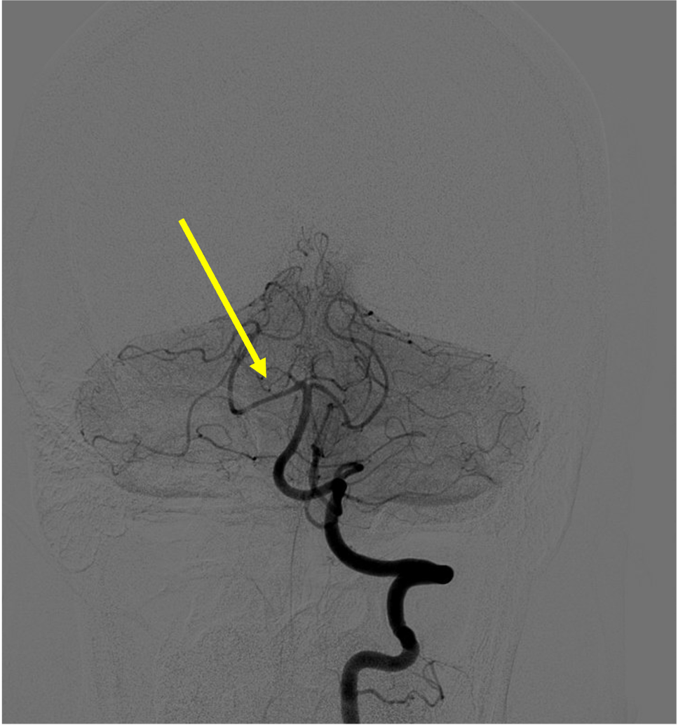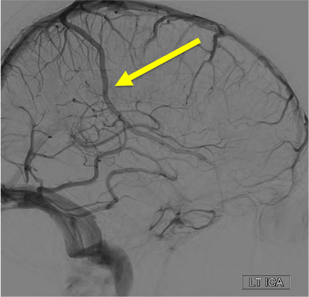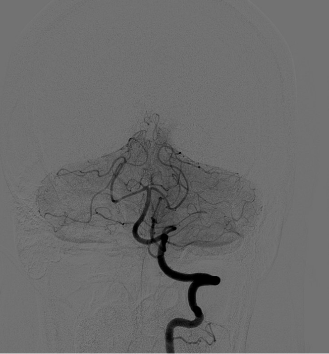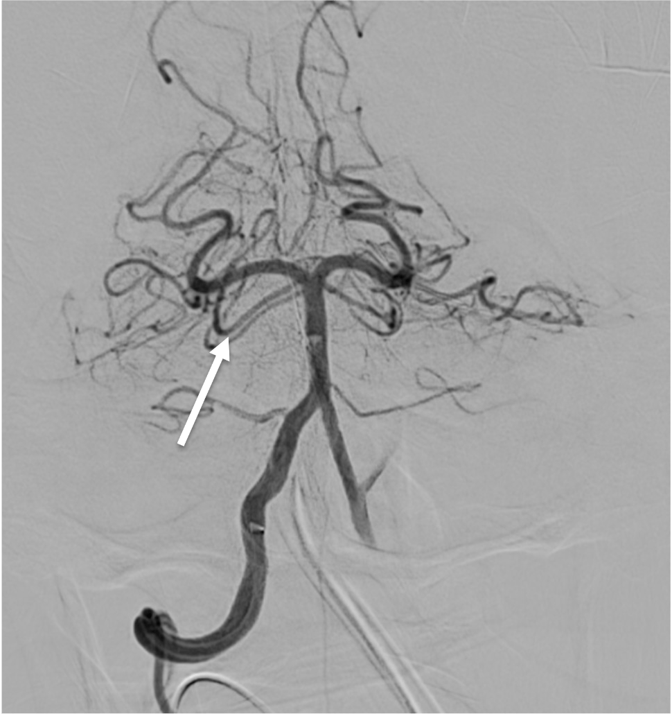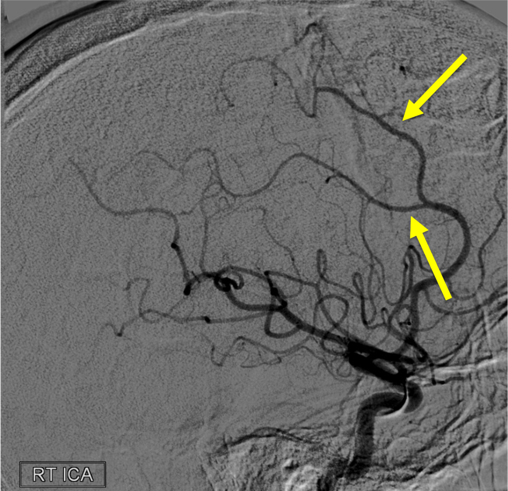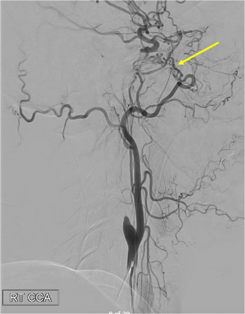 White arrow is the Ophthalmic artery-- here, likely collaterals from the ECA (through the internal maxillary artery --> ethmoidal artery) collateralize with the ICA through retrograde filling of the Ophthalmic