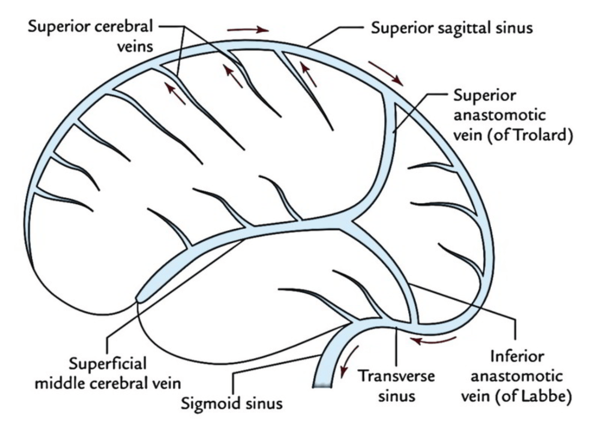 petrosal veins (blue), cavernous sinuses (white), inferior petrosal sinus (black), silhouette of the ICA (red).