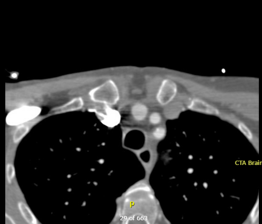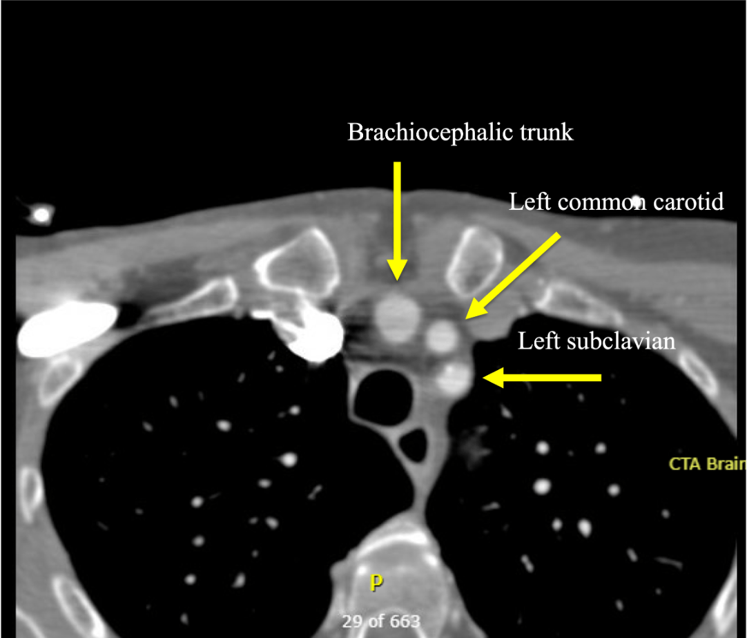 Name the three major branches off the aortic arch, as seen on this axial CTA: