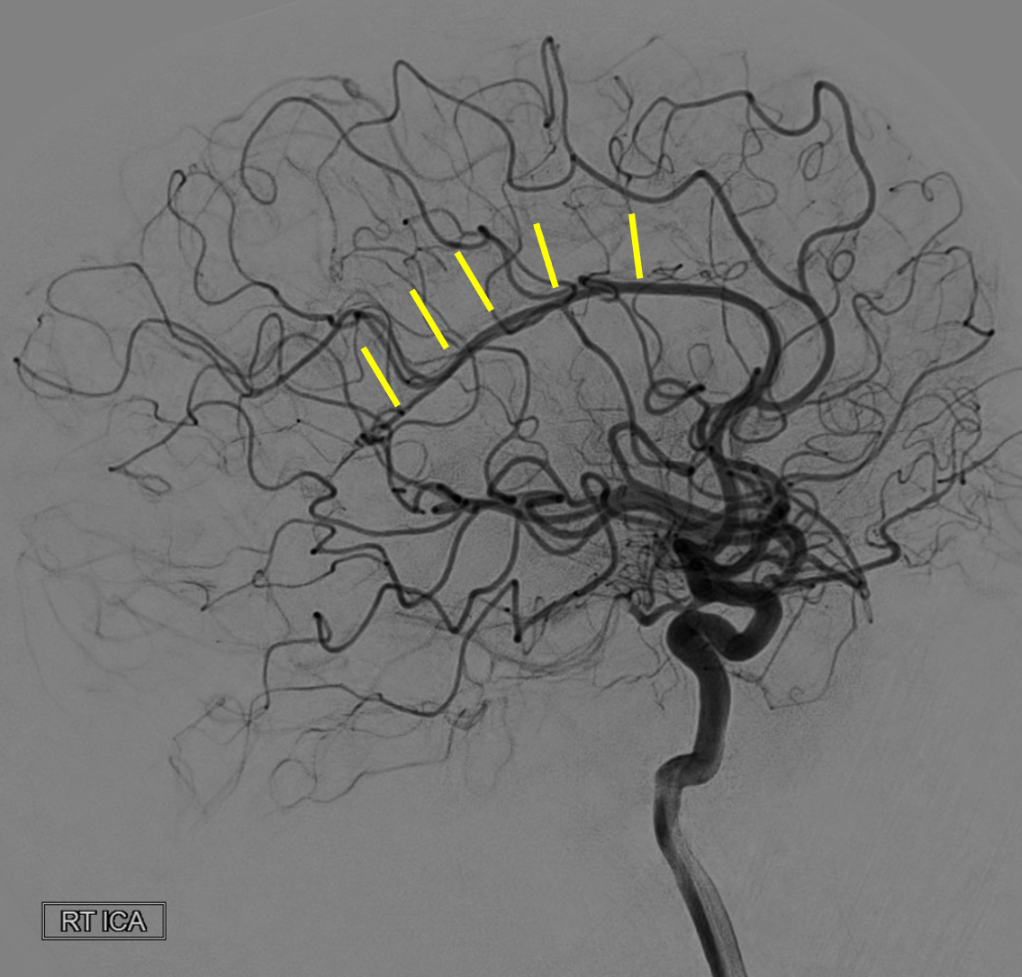 On this lateral view R ICA injection, what gyrus is located within the dashed lines?