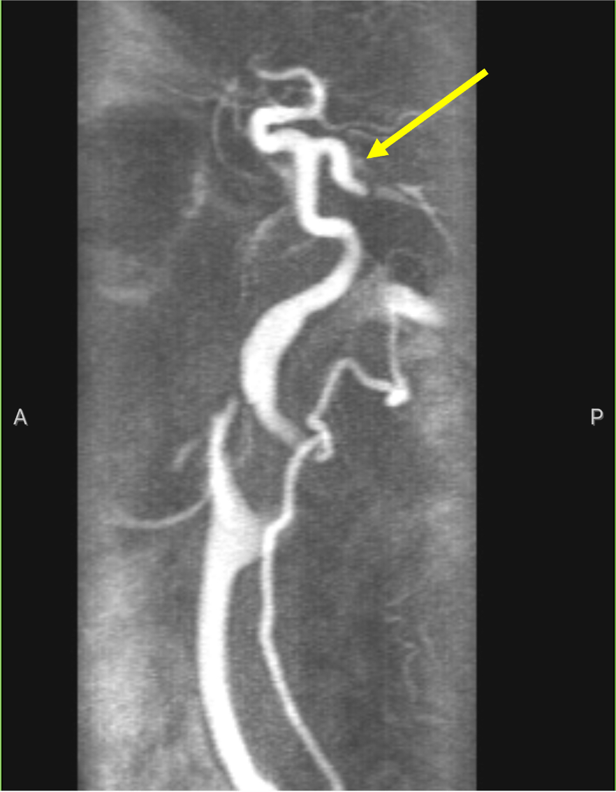 On this lateral view L ECA injection, name the vessel at the white arrow, which is the route of collateral between the ECA and ICA (yellow arrow) in this patient with longstanding ICA occlusion.