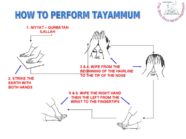 Making the intention, saying "Bismillah," striking clean earth/dust with palms, wiping the face, and wiping both hands up to the wrists.