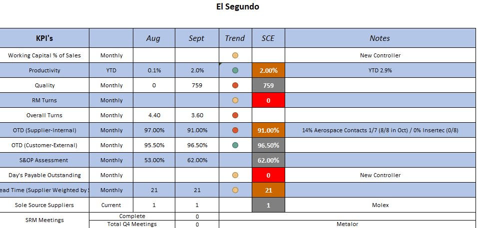 Sales, OI, OTD, Inventory Turns, Quality, Safety