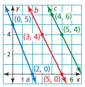 Lines b and c are parallel (red and green lines) because they have the same slopes (-2)