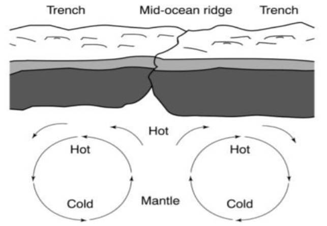 Based on the diagram, which process explains how mid-ocean ridges are formed?