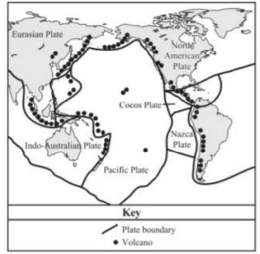 According to this map, which of the following describes where volcanoes are most likely to form in the Ring of Fire?