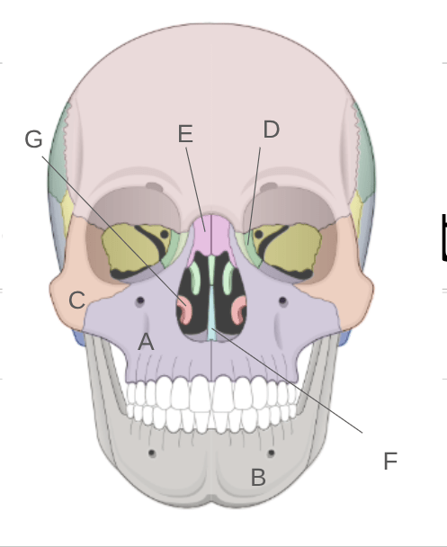 Parietal, temporal, occipital, frontal, sphenoid, ethmoid.