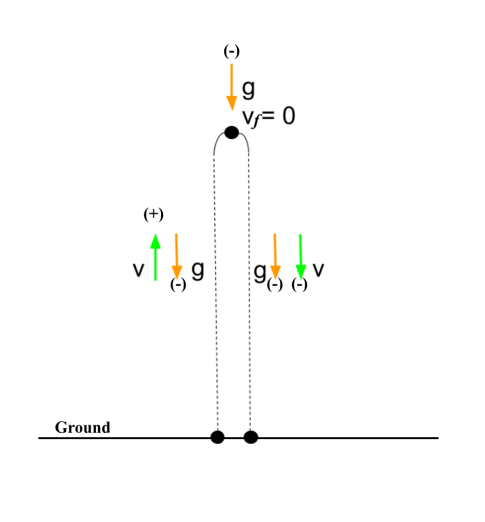 Initial velocity is positive, and -9.8 m/s2 acceleration due to gravity causes velocity to constantly decrease (slowing down as it moves upward) until it is 0 (maximum height) then negative (speeding up as it moves downward)