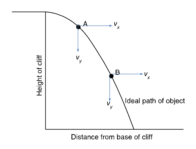For this horizontally-launched projectile, at what point (A or B) is the ball moving faster vertically? What about horizontally?