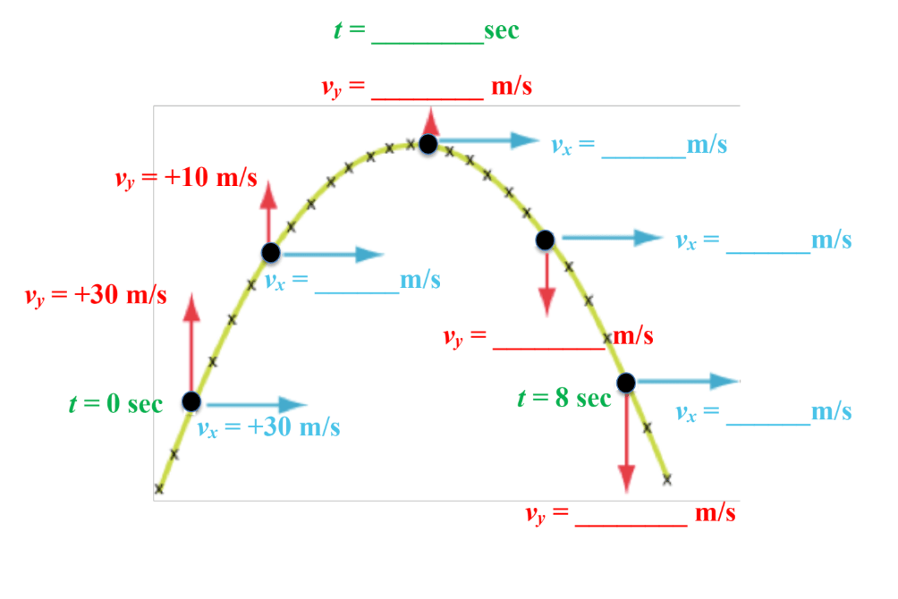 At the board, fill in the blank spaces below with the correct signs (+ or -) and values of each velocity component. Also, determine the time at which the projectile reaches its apex (highest point) in its trajectory.