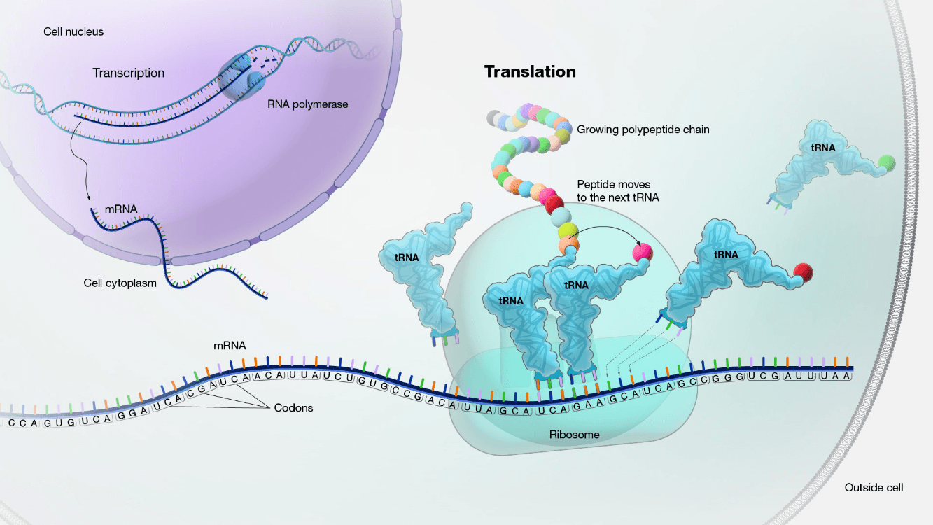 What structure in this image is responsible for reading the mRNA copied during transcription and transferring the appropriate amino acids?