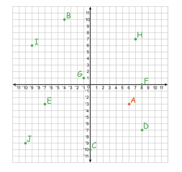 What letter represents the coordinates (6, -3)?