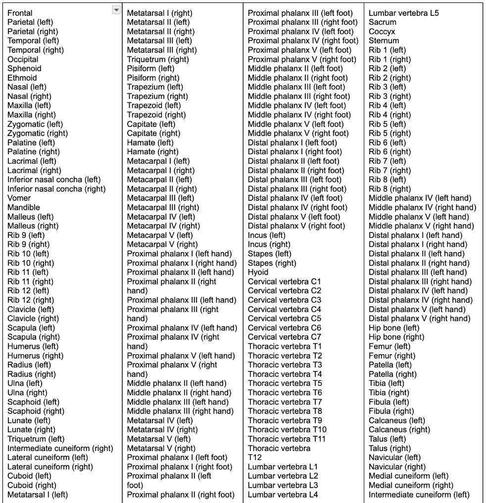 Name all 206 bones in the human body.