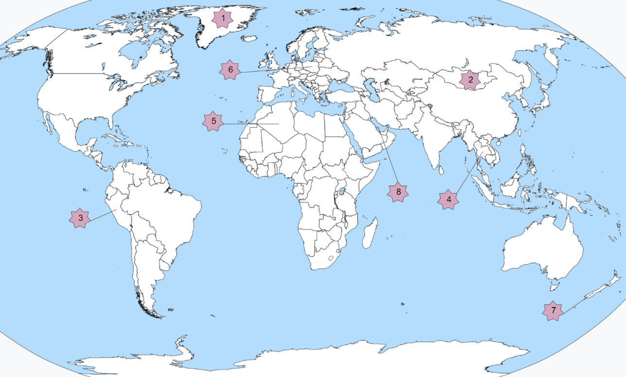1 - Greenland, 2 - Mongolia, 3 - Peru, 4 - Thailand, 5 - Algeria, 6 - Poland, 7 - New Zealand, 8 - Qatar