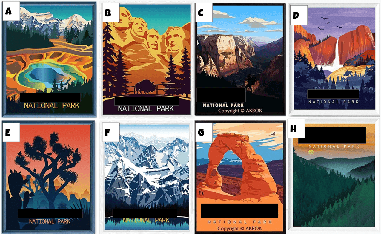 A - Yellowstone, B - Mt. Rushmore, C - Zion, D - Yosemite, E - Joshua Tree, F - Rocky, G - Arches, H - Great Smoky