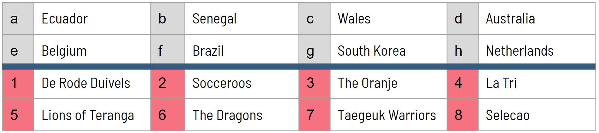 Match the World Cup team to its nickname: