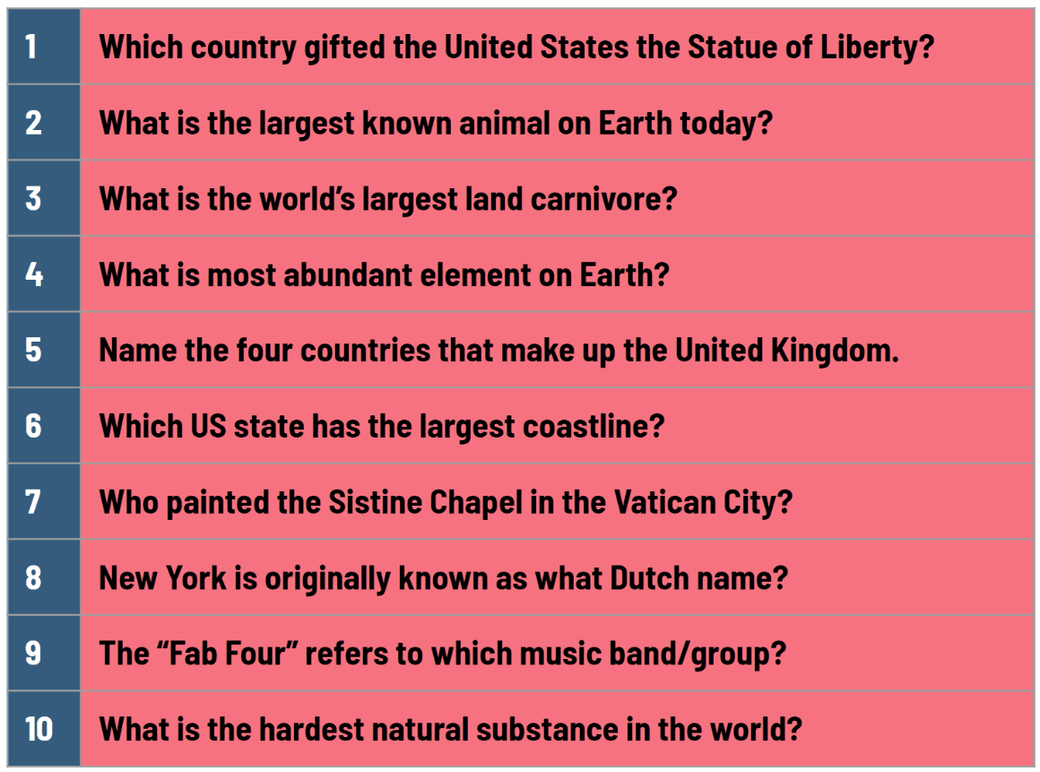 1 - France, 2- blue whale, 3- polar bear, 4 - oxygen, 5- England, Northern Ireland, Scotland, Wales, 6 - Alaska, 7 - Michelangelo, 8 - New Amsterdam, 9 - The Beatles, 10 - Diamond
